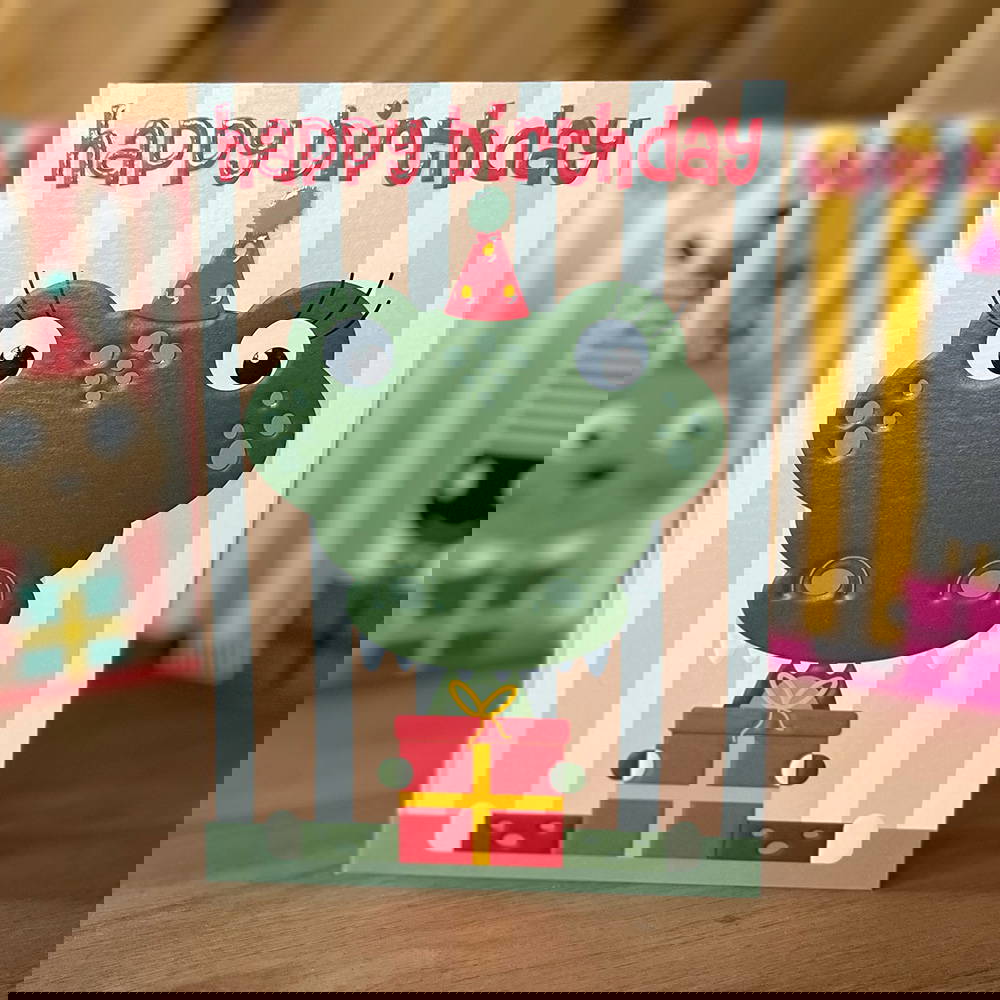 With a toothy grin and a brightly wrapped gift, Christopher Crocodile is ready to make a splash. Embossed scales and spot UV shine give this card a premium, playful finish.
