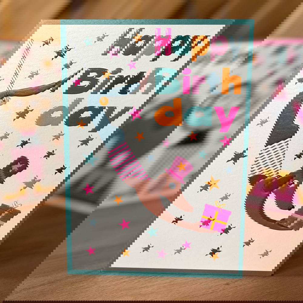 Circus Birthday Card – The Sausage Dog Trapeze Artist – long, low, and surprisingly acrobatic