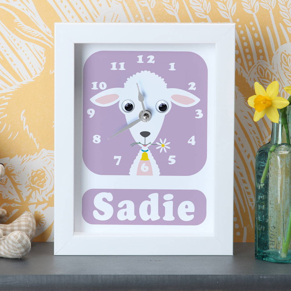 Personalised Children’s Lamb Clock with googly eyes! Simply choose a colour, include a name, and we’ll do the rest.
