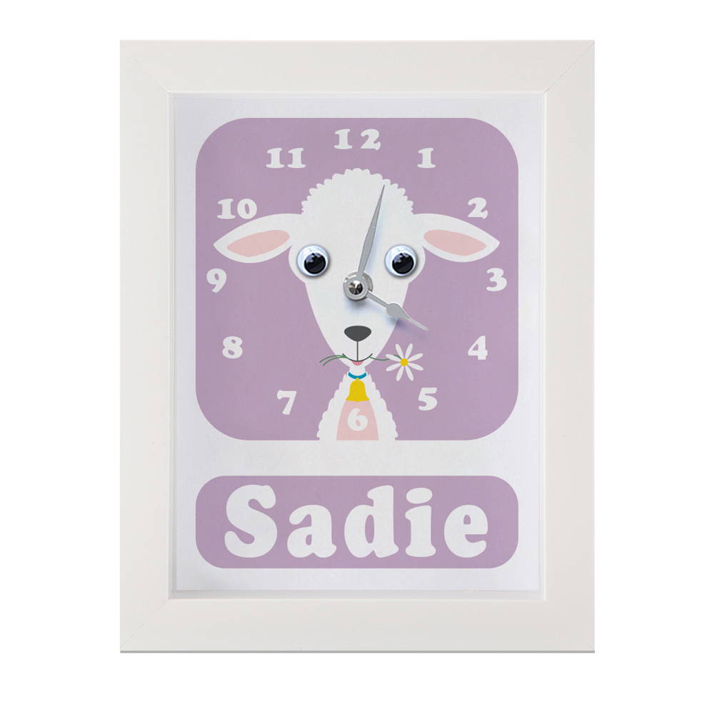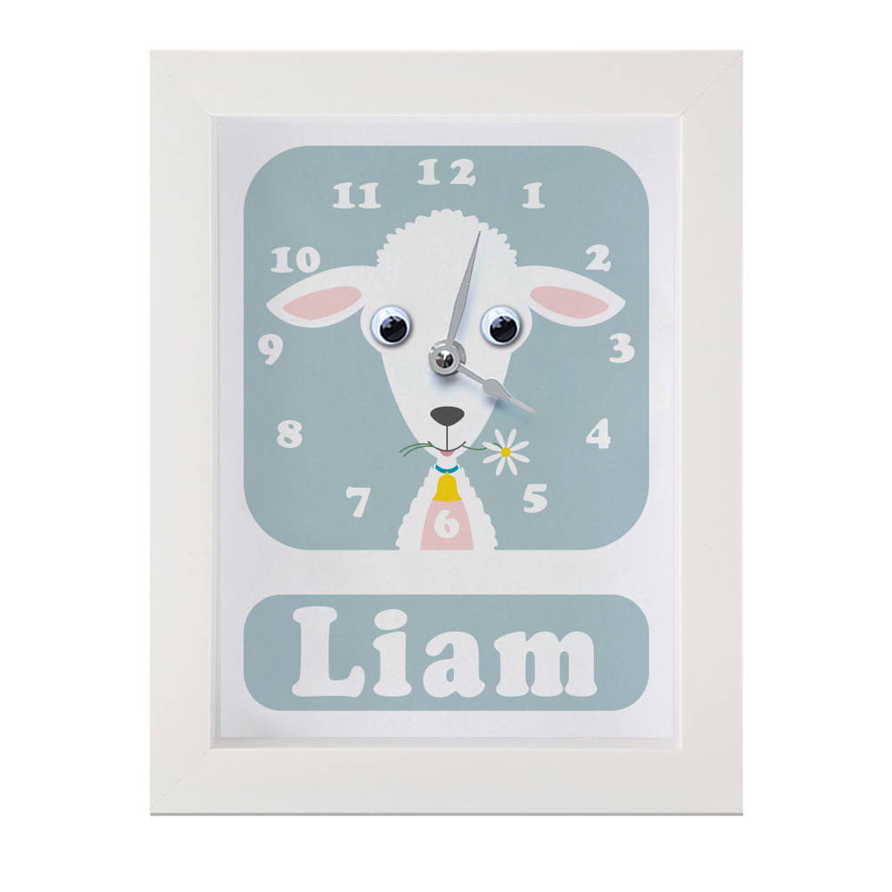 Our personalised children’s clock featuring an adorable Lamb with googly eyes makes learning to tell the time fun! Just watch those eyes wiggle and a jiggle!