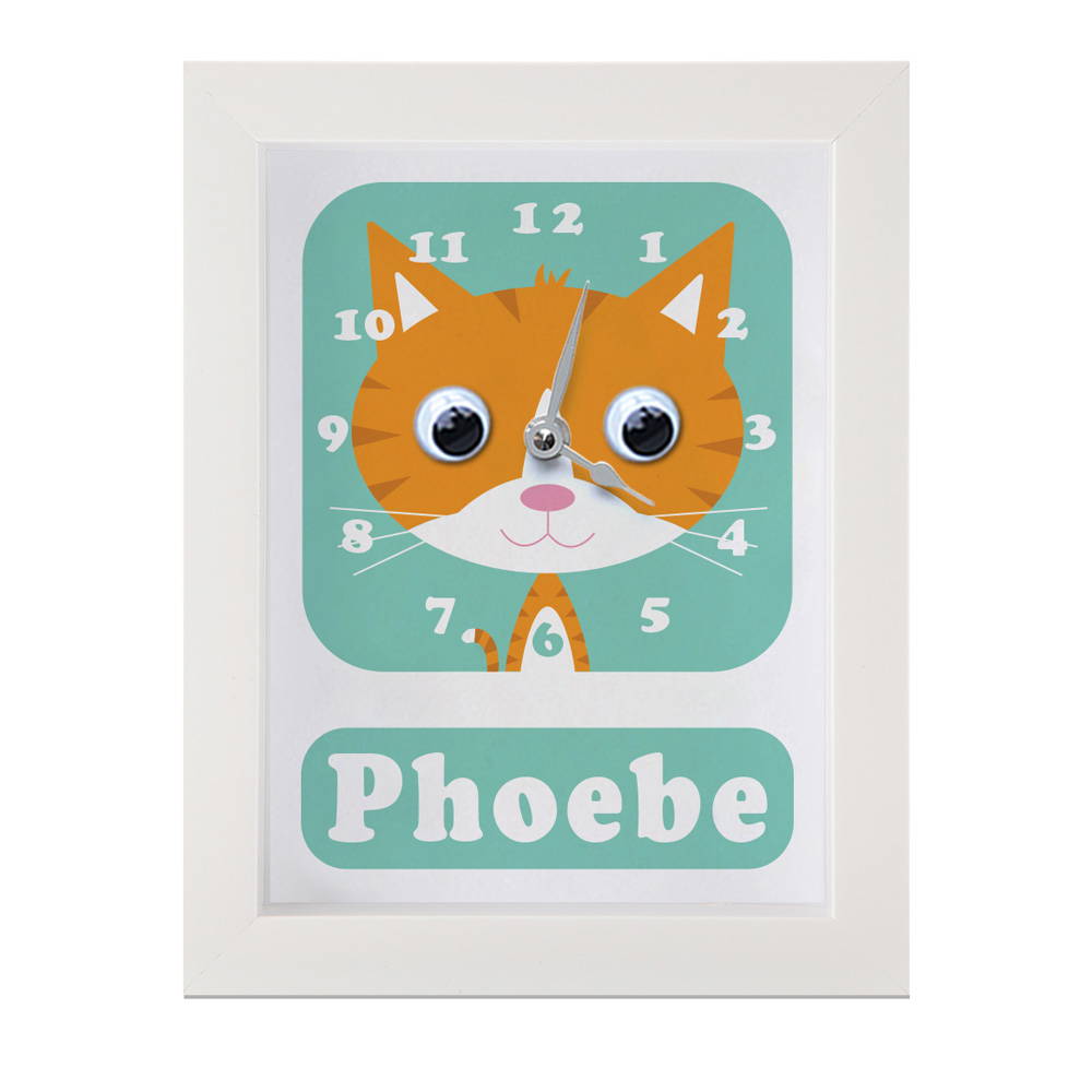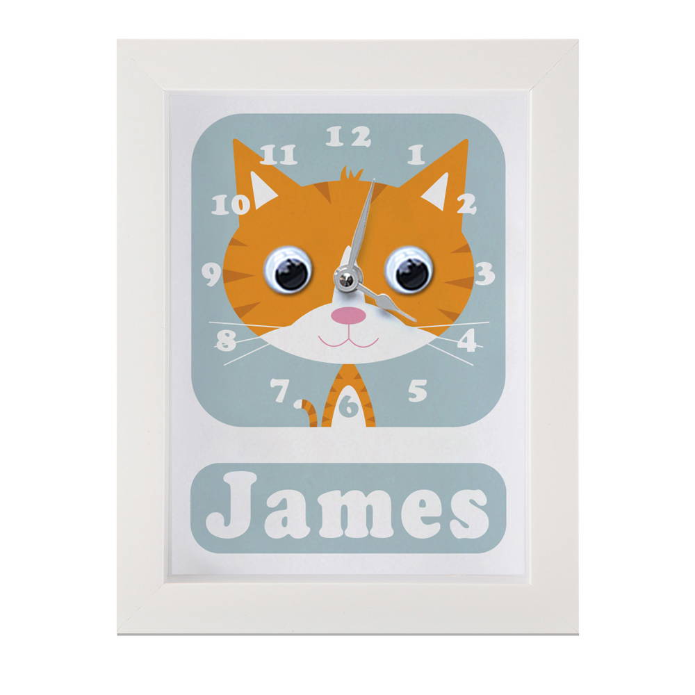 Our personalised Cat clock featuring a cute ginger Cat with googly eyes makes learning to tell the time fun! Just watch those eyes wiggle!