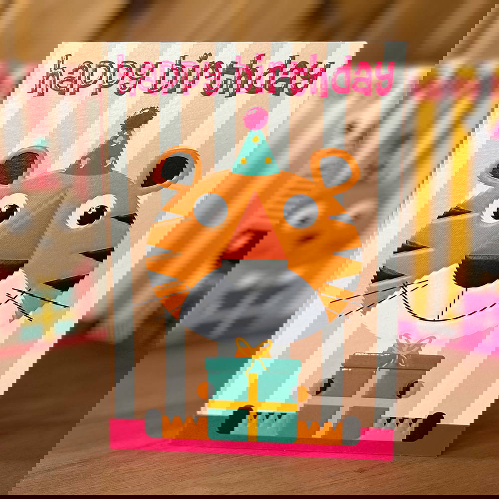 Tilly Tiger is ready to pounce into the party with a bright smile and a beautifully wrapped birthday present. Embossed details and spot UV highlights bring her stripes to life, making her the perfect pick for bold, adventurous little ones.